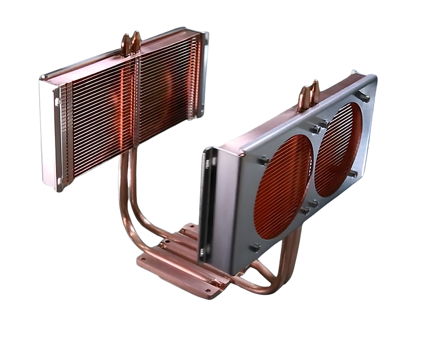 Machined vapor chambers attach to multiple heat sources while methanol heat pipes extend range.