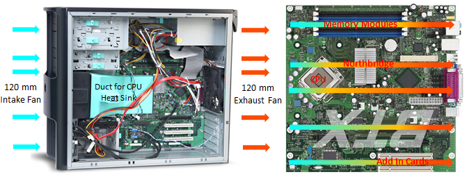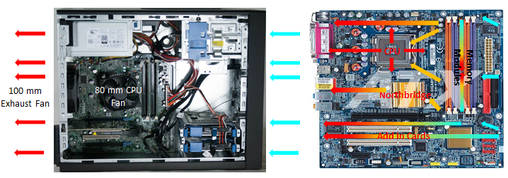 As you can see in Figure 2 (excuse my crude airflow drawings), a typical ATX layout positioned the CPU toward the rear of the machine with a single 100mm exhaust fan used to move air through the system. When necessary, a small fan was added on top of the CPU heat sink for further cooling but it distributed warm air throughout the system. Cool inlet air was impeded by forward connectors and memory modules that were perpendicular to, and positioned in front of, the CPU. Graphics cards where designed so that heat sink and associated fan faced toward the bottom of the case. From a thermal management standpoint, this design was marginal but adequate for the time.