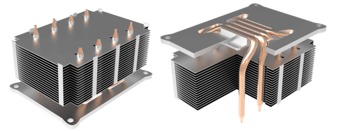 In this design, the heat source contacts the heat pipes directly. The base plate and solder interface are eliminated, thereby shortening the thermal pathway. However, additional machining is required to flatten the heat pipe surface.