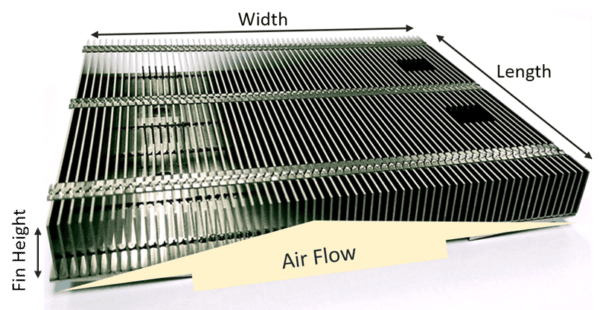 Base Information – The length and width dimensions you enter for the base of the heat sink will also be used as the dimensions for the fin pack. It’s important to note that LENGTH (of base and fin pack) will go in the direction of the AIR FLOW. Note: if you are in the early stages of heat sink design and need an estimate of the required heat sink size, refer to this online calculator.