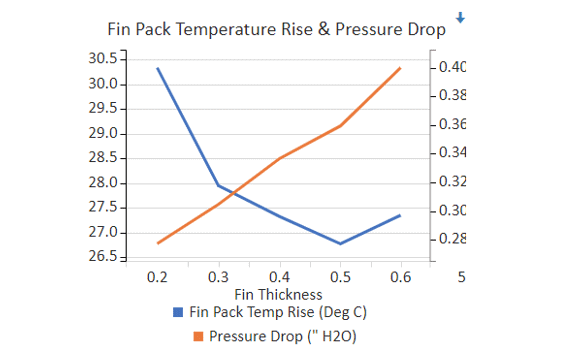 Fin Pack Information – While fin height can vary considerably by application, we typically see figures in the 10-35 mm range. Fin thickness for fin packs (zipper fins) range from 0.2 to 0.6 mm while fin spacing/gap should be at least 2X the fin thickness. Next, input the fin pack material and the max operating temperature at which the device is designed to operate. You can use the ‘Fin Pack Temperature Rise & Pressure Drop” chart as a starting point for selecting the appropriate fan. Conversely, if you know the fan to be used, alter the fin and air flow variables to achieve acceptable pressure drop numbers. Lastly. choose the type of TIM to be used from the drop-down menu.