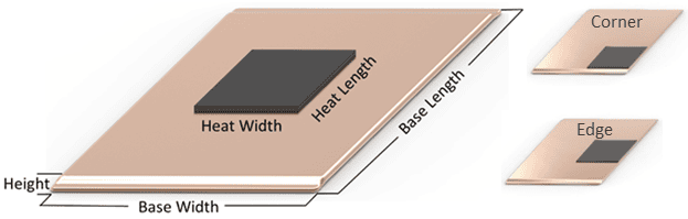 Heat Source Length, Width, and Location – Self-explanatory especially with the provided diagram. Remember that chip location will greatly affect base delta-t for solid metal while its effect on the vapor chamber delta-t is negligible. A general rule of thumb is that vapor chambers become attractive as the ratio of base area to heat source area surpasses 10:1.