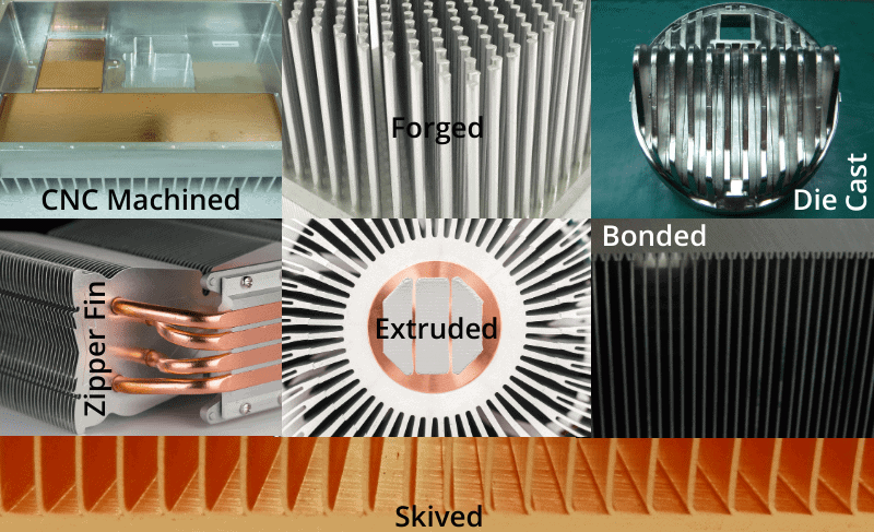 The most common manufacturing methods for heat sinks used in conjunction with heat pipes or vapor chambers are CNC machined, forged, die cast, zipper fin, extruded, bonded, and skived.