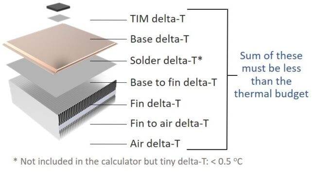In order to stay within the thermal budget, the total temperature rise (Delta-T) from the heat source to the surrounding air, as illustrated in the image above, must be less than the available thermal budget. Rugged devices generating only a small amount of heat and/or low power densities watts/cm2) can likely be cooled by standard, traditional solid metal heat sinks. As power increases and thermal budgets dip to between 20-40 oC heat pipes or vapor chambers are the likely solution. Budgets under 20 oC can probably only be achieved using pumped liquid cooling or thermoelectric devices.