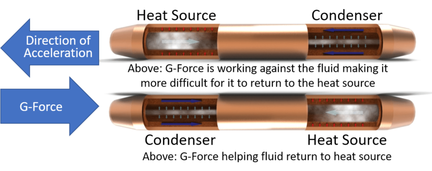 As seen in the image above, acceleration (like gravity) reduces the capillary performance of the sintered wick if it is oriented in the wrong direction. In a static environment, heat pipes oriented vertically with the condenser directly below the evaporator are under 1G of load, causing the maximum power handing capacity (Qmax) of the heat pipe to be greatly reduced. An acceleration of 1G equates to a rate of change in velocity of around 22 mph for each second of elapsed time. In this scenario, the QMax of the heat pipe on the bottom of the illustration will be reduced by around 90% when it’s flipper the other way (like the top heat pipe). It’s critical that thermal engineers properly model both the level, duration, and acceleration frequency when designing two-phase heat sinks as infrequent, small bursts of short duration will have little if any effect, yet sustained acceleration can cause catastrophic failure if not properly designed.