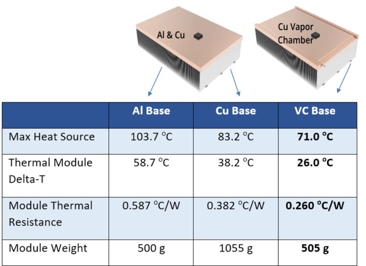 Assume we have a thermal budget of 40oC in a forced convection environment as outlined in the image below and detailed in a recent blog. While the solid aluminum base looks attractive from a weight standpoint, having a total heat sink delta-T of nearly 59 oC removes it from consideration. Keeping cost in mind, we find that the same heat sink with a copper base is within the thermal budget, but at a huge weight penalty (nearly double). By transitioning to a vapor chamber solution, we gain back all but a fraction of the weight gain although at a small cost premium. An added benefit comes from a substantially lower heat sink delta-T, which could be useful if hotter running heat sources are being considered.