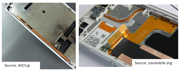 Within the last year and a half, NEC and Sony have both introduced smartphones using an ultra-thin heat pipe. Reported to be in the 0.6mm range at the thinnest point, these two phase devices spread and transport heat from the main processing unit. Presumably this was done to implement slightly more liberal power management techniques as well as to reduce enclosure temperature while still allowing the quad-core Snapdragon processor to perform at near peak conditions. Weight gain from switching from graphite-carbon must have seemed an acceptable trade-off.